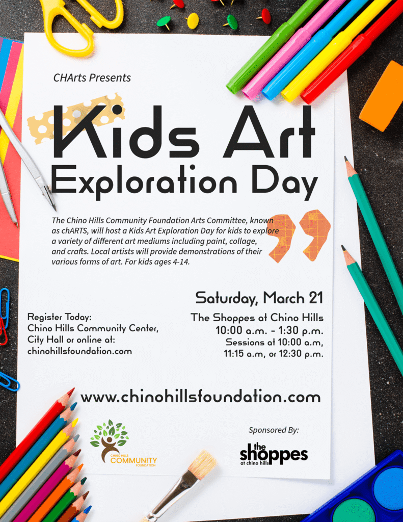 The the Chino Hills Community Foundation Arts Committee, (chARTS), will host a Kids Art Exploration Day for kids to explore a variety of different art mediums, including paint, collage, and crafts. Local artists will provide demonstrations of their various forms of art.