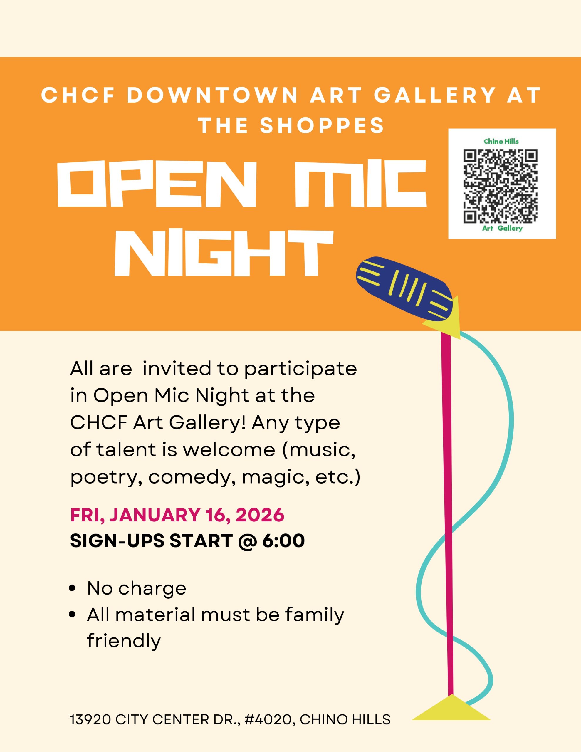 Friday, January 16 at 6:00 p.m. Chino Hills Community Center 13920 City Center Dr.,#4020, Chino Hills