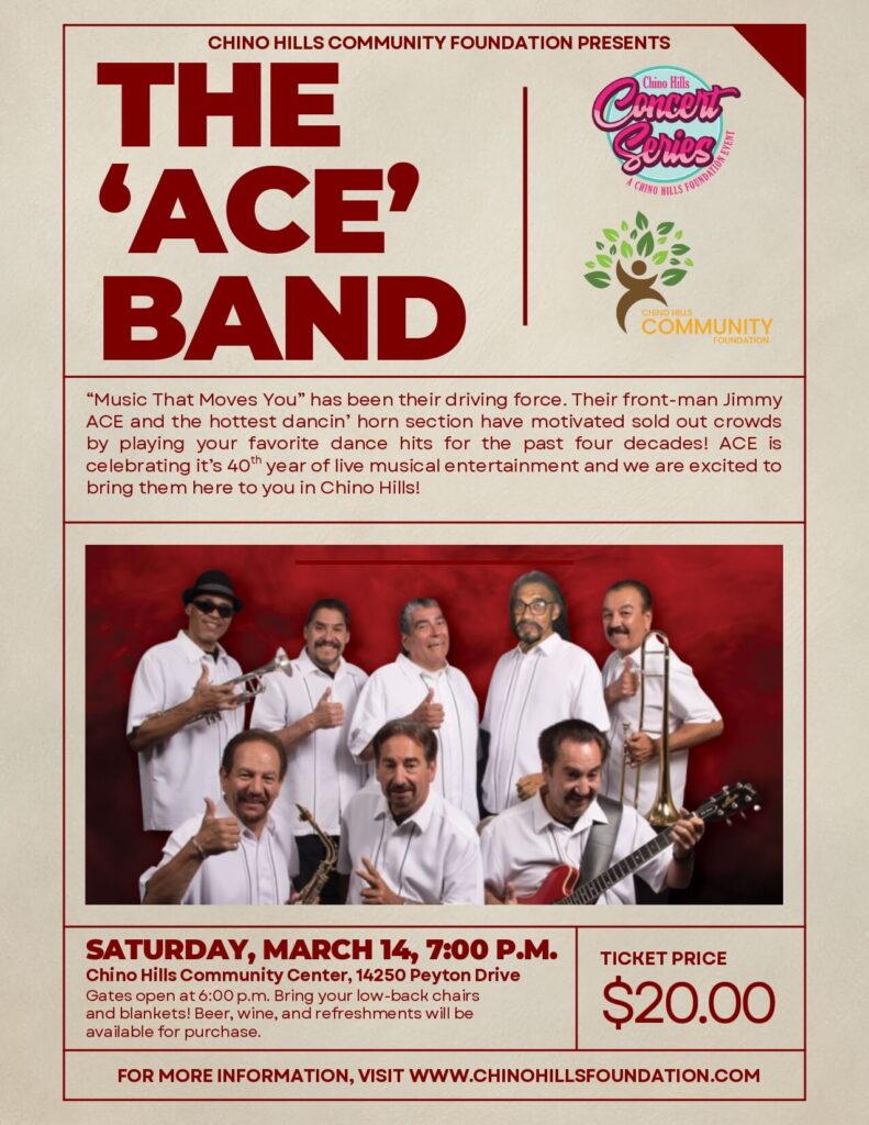 Saturday, March 14th, 7:00p.m.The Ace BandGates Open at 6pmChino Hills Community Center14250 Peyton Drive, Chino Hills